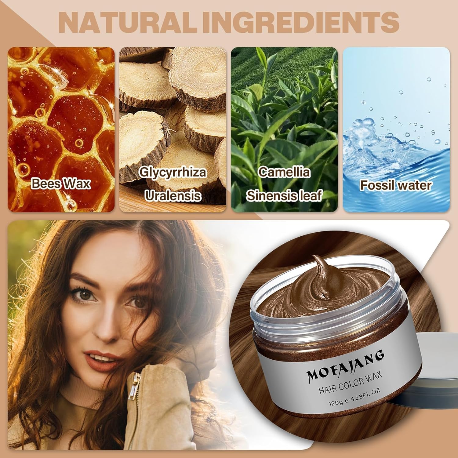 The Hair Color Wax is made of natural ingredients like Tea Extract, Licorice Extract, Fossil Water, and Beeswax, no harm to hair, kids safe.